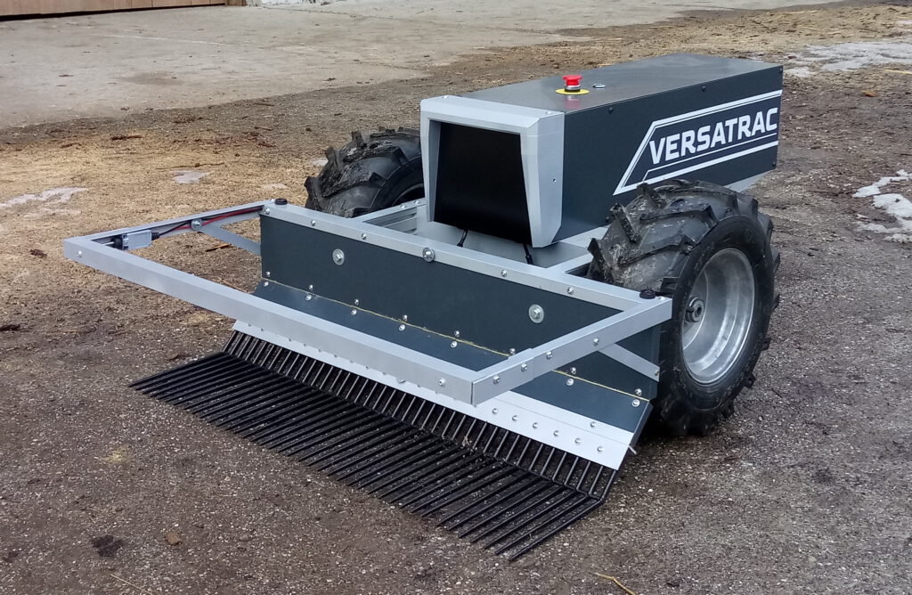Der Versatrac kann dieses Dilemma lösen. Er ist ein kompakter Agrar-Roboter mit universalen Einsatzmöglichkeiten. In Verbindung mit der Äppelgabel kann er als autonomer Entmistungsroboter das Abäppeln erledigen. Die Besonderheit: Die Maschine ist kompakt genug um auch auf Einzelpaddocks, eingestreuten Liegehallen und verwinkelten Ausläufen arbeiten zu können! Der geringe Bodendruck, maximale Offroadfähigkeit und robuste Sensoren erlauben das Fahren bei schlechtem Wetter. Geöffnete Tore braucht die Maschine dabei nicht – Der Zaun wird einfach unterfahren.
